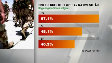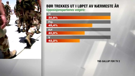 En undersøkelse utført av TNS Gallup for TV 2 viser at 45,7 prosent av befolkningen vil ha soldatene hjem fra Afghanistan. Samtidig sender fredsprisvinner Barack Obama nye styrker ned – men med en klausul om tilbaketrekning innen 2011.