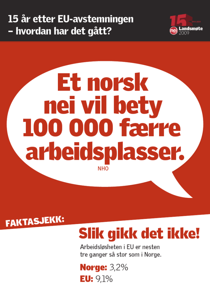 Først til den som er kjernen i Ja-sidens propagandaplakat fra 1994. Antall arbeidsplasser i Norge: