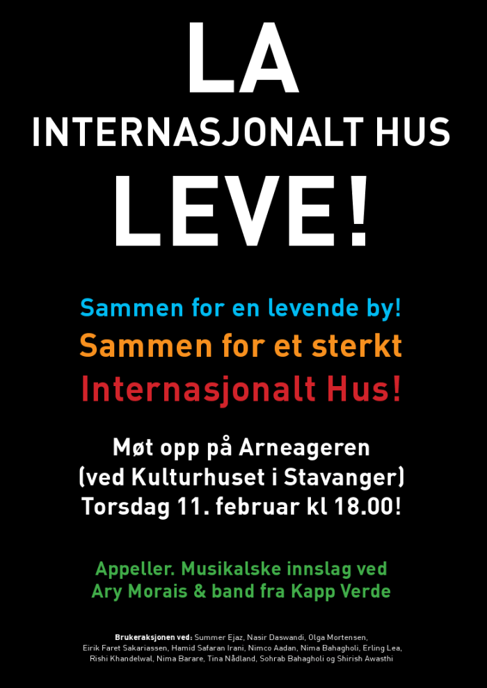 Markering for Internasjonalt Hus! Eirik Faret Sakariassen / 5. februar 2010 Ranger dette:Del dette innleggetTweet Klikk for å sende en lenke med e-post til en venn(åpnes i en ny fane) E-post Lik Laster inn...