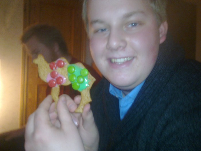 I dag har jeg vært på juleverksted hos Daniel, Torstein, Marianne og Ulf sammen med Therese og Henrik. Der var det pepperkakekameler, og jeg så det som min oppgave å lage en SV-kamel. Den skal senere spises.