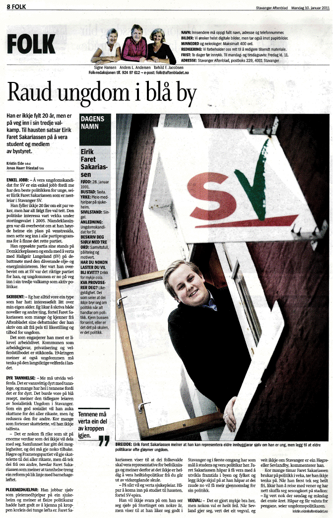 Portrett-intervju i Aftenbladet: Raud ungdom i blå by Eirik Faret Sakariassen / 10. januar 2011 Ranger dette:Del dette innleggetTweet Klikk for å sende en lenke med e-post til en venn(åpnes i en ny fane) E-post Lik Laster inn...
